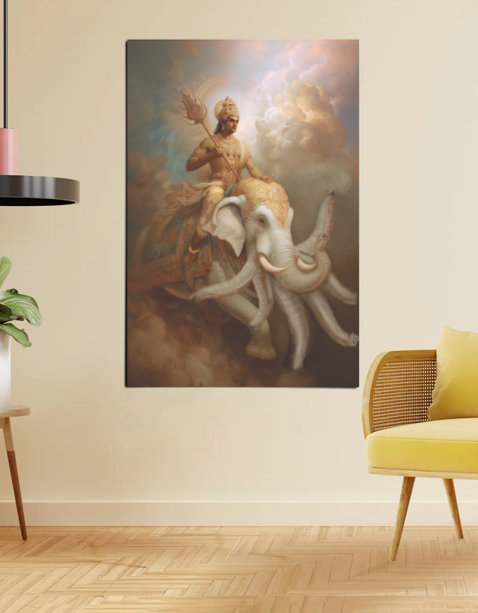 Invoke the divine presence of Indra Dev, the King of the Devas and ruler of Svarga (heaven), with this majestic spiritual poster. As the god of rain, thunder, and cosmic authority, Indra rides his celestial elephant Airavata, wielding the Vajra (thunderbolt)—a symbol of unmatched power and divine protection.