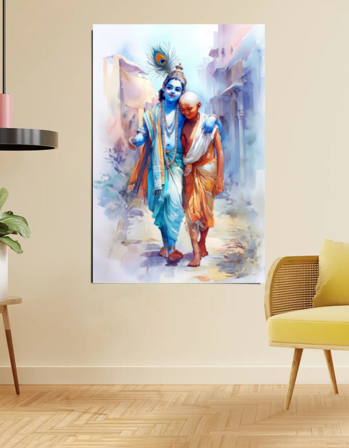 Devotional Krishna and Sudama poster on premium 300 GSM art board. Vastu-compliant, fade-proof, rolled & ready to gift for any sacred occasion.