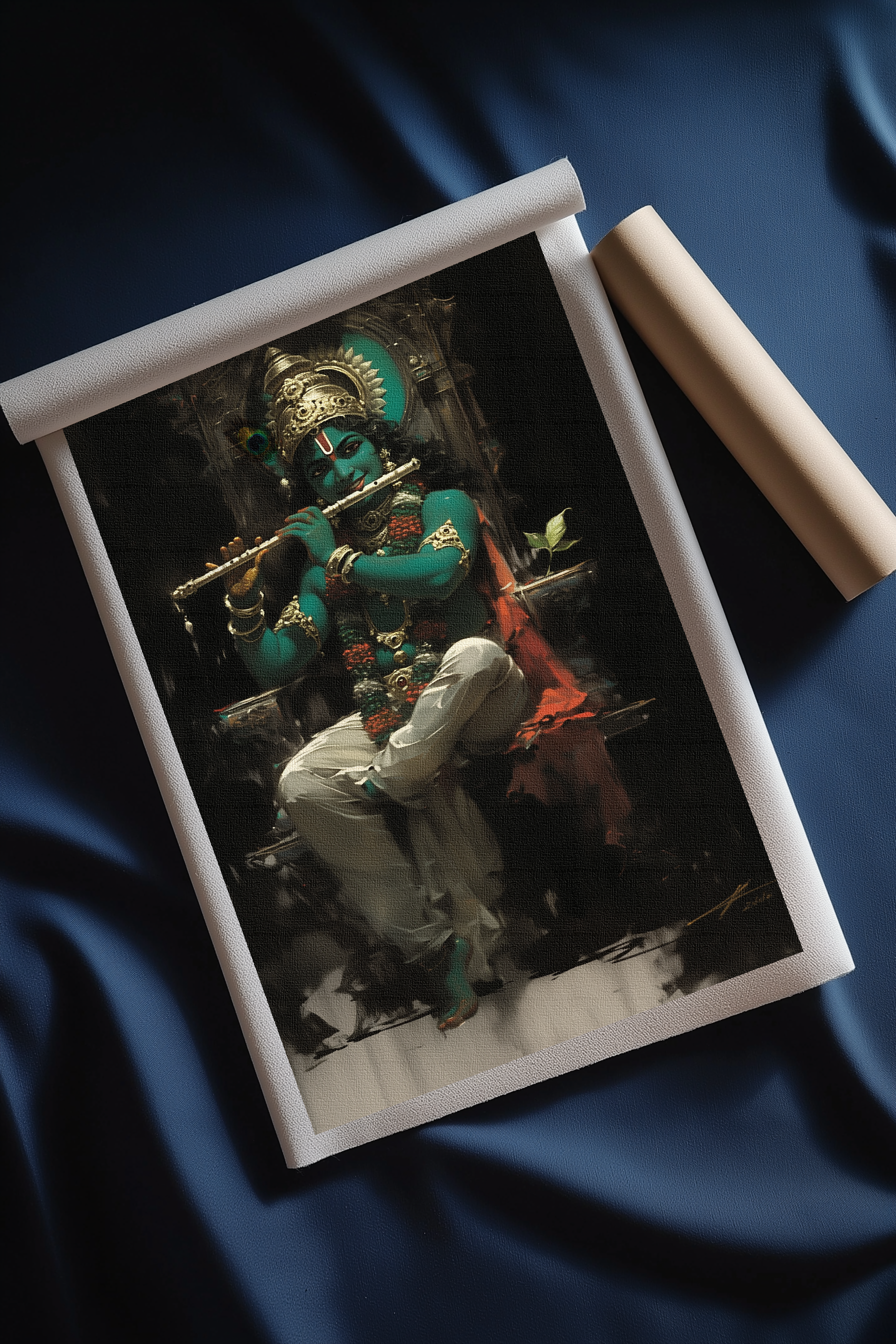 Lord Krishna Sitting on Throne Playing Flute – Spiritual Canvas Print Roll for Divine Decor